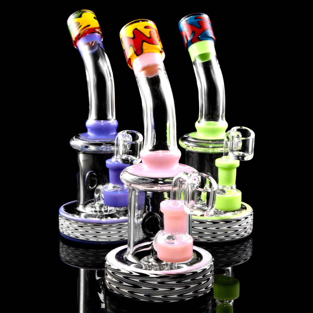 Stemless bent neck dab rig water pipe with reverse colored glass accents, bright neon features and stemline showerhead percolator.